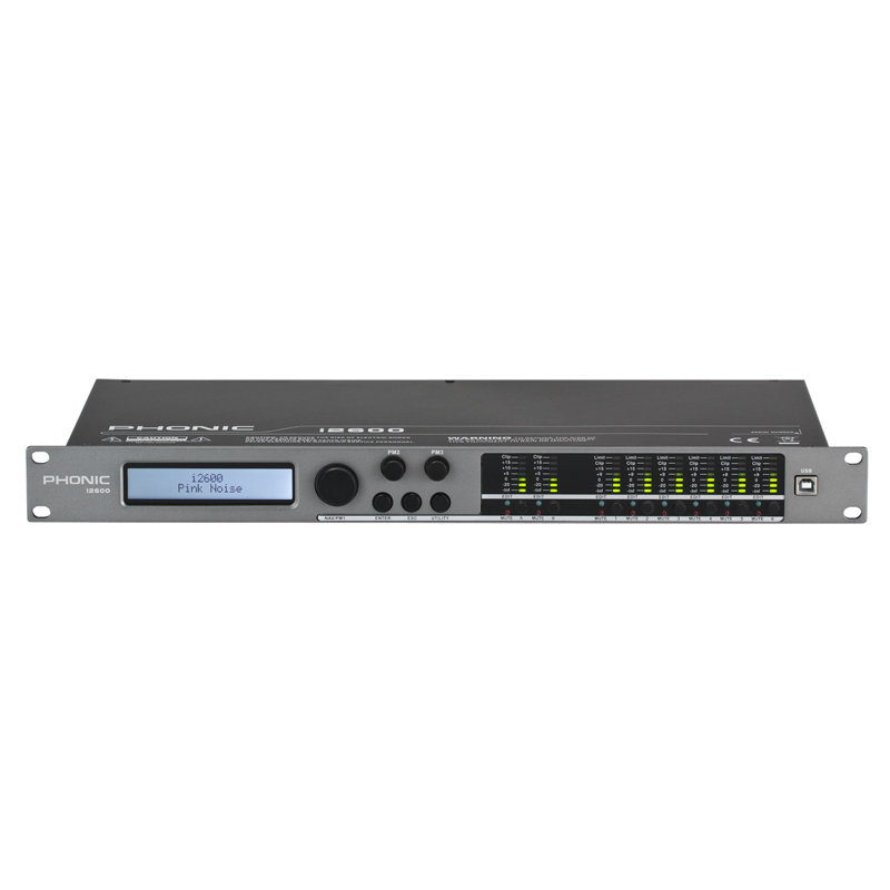 Phonic introduces the i2600 speaker management system, an all inclusive solution that completely redefines speaker EQ and crossover management for speakers. Phonic’s i2600 features 2 balanced inputs including 1 channel precise RTA and 6 balanced outputs in addition to offering S/PDIF digital connectivity. The Phonic i2600 software incorporates numerous state-of-the-art functions and allows for precise adjustment of 4 band parameter equalizers, 15 band graphic equalizers , input and output delay alignment, crossovers, gates, compressors, limiters, phase reversal, feedback elimination, and sub-harmonic generator. Two manners of control are provided to customers. All programs and parameters can be controlled through either the PC software or by using the onboard controls.